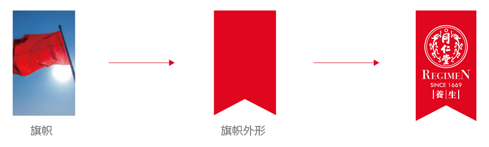 旗幟的造型比直接用方形更有意義,旗幟代表著榜樣和標桿,正是因為如此,我們希望以旗幟的形式賦予同仁堂品牌新的理念,樹立同仁堂中國醫(yī)藥行業(yè)標桿;同時旗幟也像絲帶一樣,有祝福、吉祥之意,象征了同仁堂養(yǎng)生對人類健康的美好祝愿,寓意國之瑰寶,同仁堂在傳承和創(chuàng)新中繼續(xù)造福人類。而且旗幟的圖形更加容易與后期的營銷物料進行內(nèi)容布局結(jié)合。