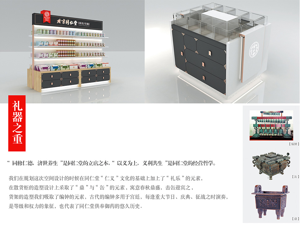 我們在這次專柜設計的時候在同仁堂“仁義”文化的基礎上加上了“禮樂”的元素。 “ 擊缶迎賓”表現(xiàn)“ 禮器之重”。
