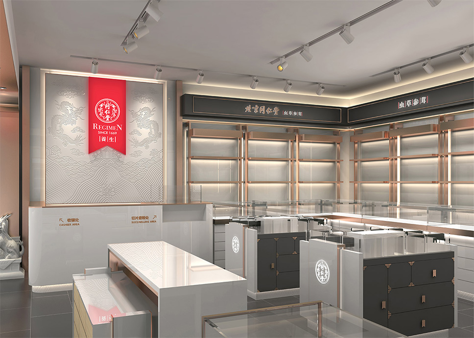 內(nèi)部設計相比外部設計而言,涉及的設計元素更多,難度也更大。涉及的元素包括通道、柜臺、色彩、燈光、音樂、商品陳列布局等。我們依據(jù)同仁堂的文化屬性,強化空間布局及持續(xù)改善功能,讓顧客停下腳步,體驗、了解商品,實現(xiàn)產(chǎn)品動銷,門店增量。