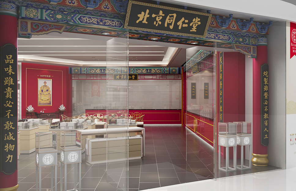 以中國傳統(tǒng)的對稱平衡為基本原則,以戶為門,以牖為窗,在保留了同仁堂經(jīng)典元素的同時進行店面優(yōu)化升級。