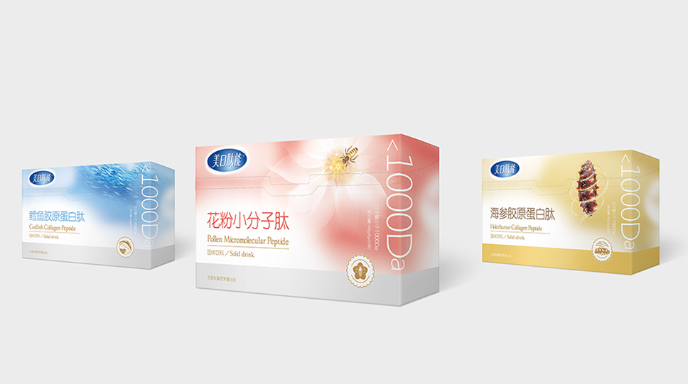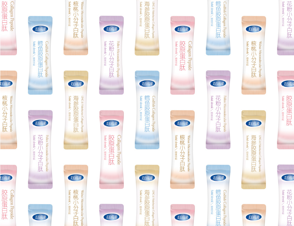 美日肽能膠原蛋白肽固體飲料,將保健食品休閑化、生活常態化,產品定位快消品概念。包裝形式定位休閑、時尚、輕便,迎合現代人士快節奏的生活需求。經獨有專利技術提取出小分子肽,吸收率遠優于氨基酸和蛋白質,效果比食用同等量蛋白可提高數十倍。包裝形象用放大的數字突出產品的專業性和核心賣點,通過奇幻的畫面,讓受眾直觀感受到小分子肽的神奇力量。色彩定位根據產品屬性和人群,定位清雅、唯美、時尚,贏得年輕受眾的一致認可。