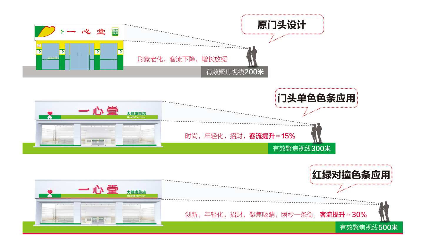 在零售行業(yè),門頭就是“招財(cái)神”,也是藥店SI設(shè)計(jì)的第一步。既然門頭是“找財(cái)神”,那么招財(cái)?shù)那疤岜仨毷窍缺豢吹剑簿褪且劢埂R驗(yàn)橄M(fèi)者有一種本能就是尋找聚焦點(diǎn),而色彩本身就是為了實(shí)現(xiàn)聚焦而存在的,所謂色彩營銷,就是要在銷售環(huán)境中為產(chǎn)品找到那個(gè)聚焦點(diǎn),而門店的聚焦點(diǎn)就是門店的流量入口,所以一心堂的門頭開發(fā)策略就是色彩的營銷策略。
